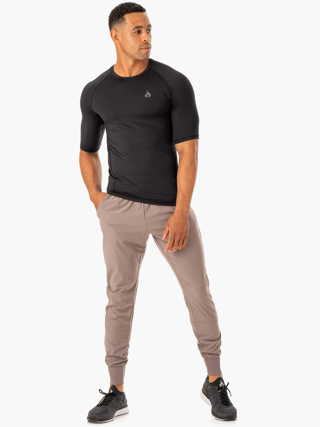 New fabrics, same performance. Our first-ever stretch fabric track pants allow you to move freely from the squat rack to the sofa. The internal pockets store your essentials perfectly, while the elongated cuffs keep you locked in while you’re lifting, for a distraction-free workout. Slim fit Lightweight Encased elastic waistband Internal adjustable drawcord Open pockets Heat-sealed Ryderwear logo to hip Rib cuff Inner leg seam: 77cm Recommended for TrainingModel is 186cm tall. He usually wears a size M to L and is wearing a size M. His waist measures 82.5cm and his hips measure 100cm. Main: 88% Polyester/12% SpandexContrast: 96% Polyester/4% Elastane