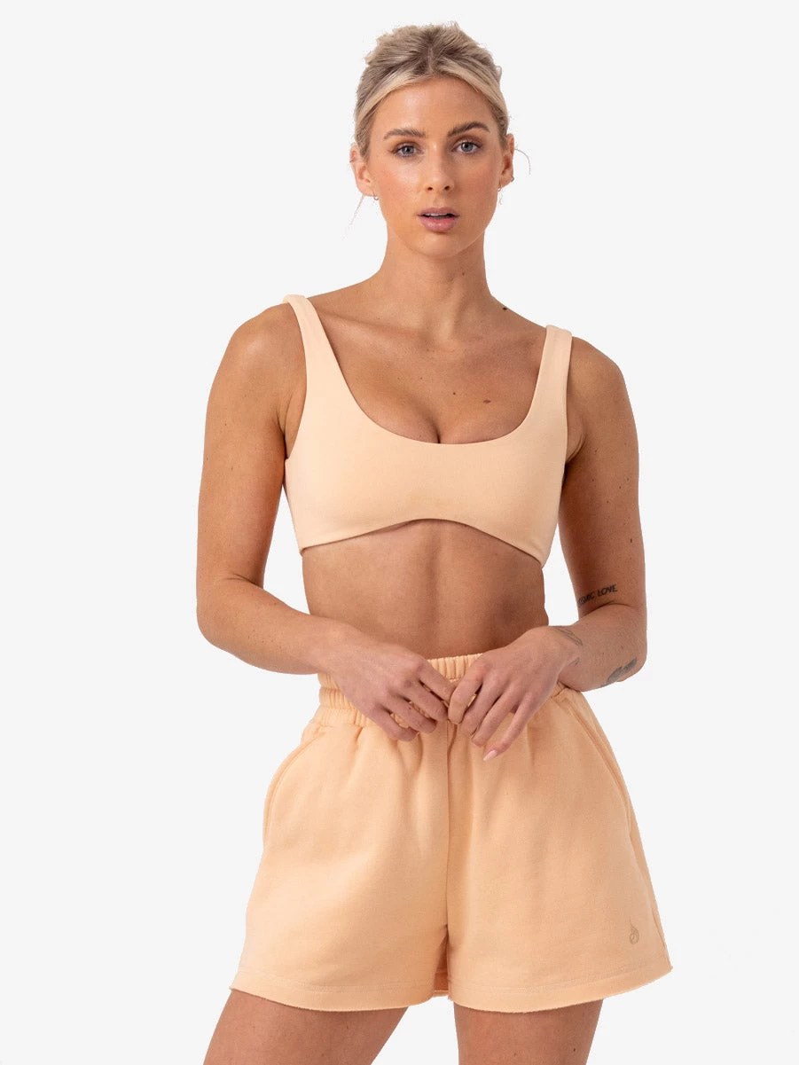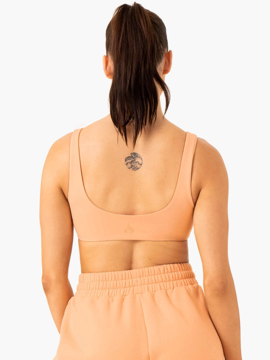 Live your rest life in this ultra-comfortable loungewear piece. Created for the sofa, not the squat rack, this sports bra elevates your rest day look with a scoop neck & back that flatters your physique. Curved hem Low cut scooped back No padding Heat-sealed Ryderwear logo placed on chest Model is 170cm tall, she usually wears a size S and is wearing a size S, her bust measures 87cm and her waist measures 67cm. Main: 83% Nylon/17% ElastaneLining: 90% Polyester/10% Elastane