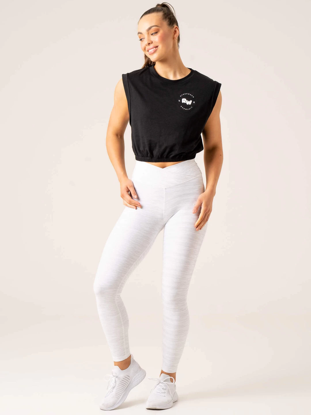 Model is 173cm tall, she usually wears a size S and is wearing a size S. Her bust measures 80.5cm and her waist measures 68cm. Cropped length Flattering rounded neckline Wide shoulders with rolled edges Low cut armholes for ventilation Waistband with encased elastic Made from a soft polyester blend fabric 65% Polyester/35% CottonRecommended for training & lifestyle.