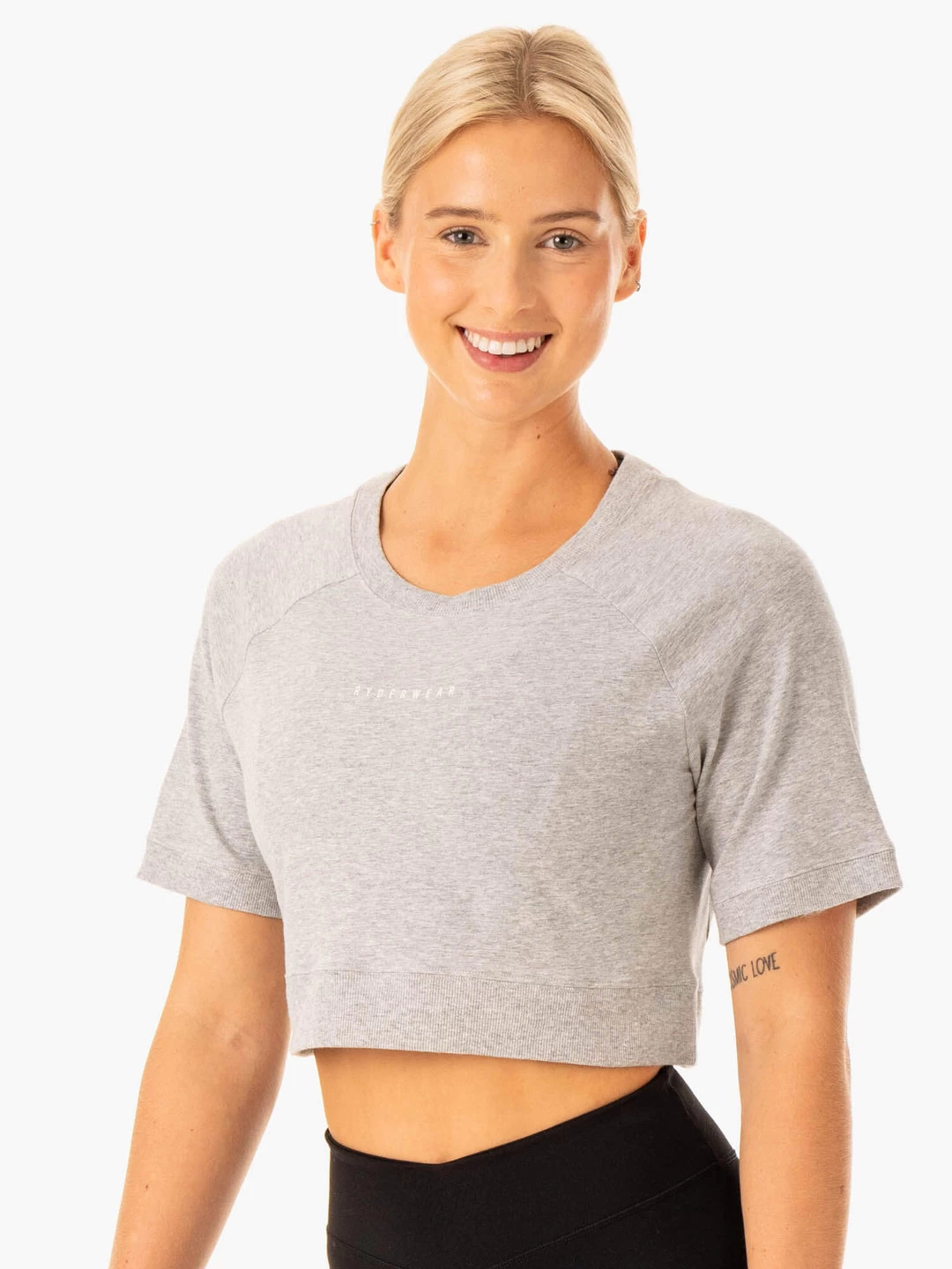 Wear this versatile cropped tee from the squat rack to the sidewalk. The contrast of cotton & ribbed fabrics offer ultimate comfort, while the cropped length flaunts your figure. Cropped Slim fit Crewneck Rib hem Heat-sealed Ryderwear wordmark to chest Model is 171cm tall. She usually wears a size XS to S and is wearing a size S. Her bust measures 84cm and her waist measures 63cm. Main: 92% Cotton/8% Elastane Contrast: 94% Cotton/6% Elastane