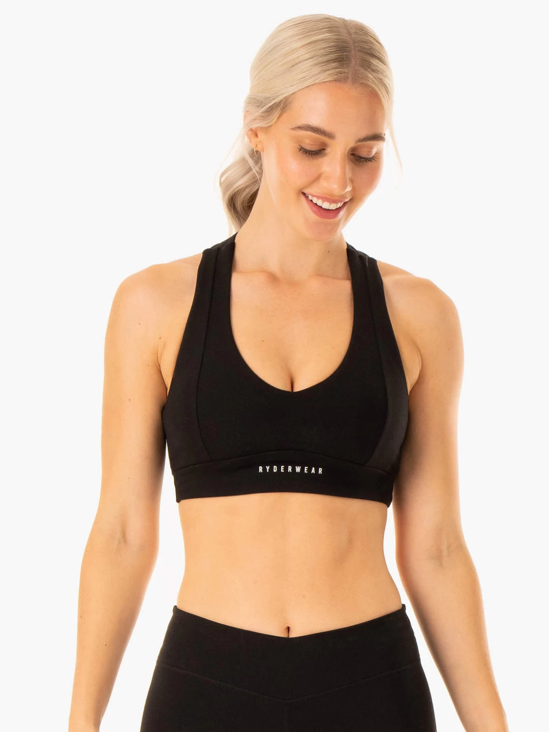 Level up your everyday basics. This staple sports bra elevates your performance and your physique, with a flattering V-style and lightweight fabric that moves with you. V-Neckline Pullover construction Removable padding Medium support T-Back Heat-sealed Ryderwear logo at front Medium support Model is 179cm tall. She usually wears a size S and is wearing a size S. Her bust measures 85.5cm and her waist measures 64cm. Main: 83% Nylon/17% Elastane Lining: 90% Polyester/10% Elastane