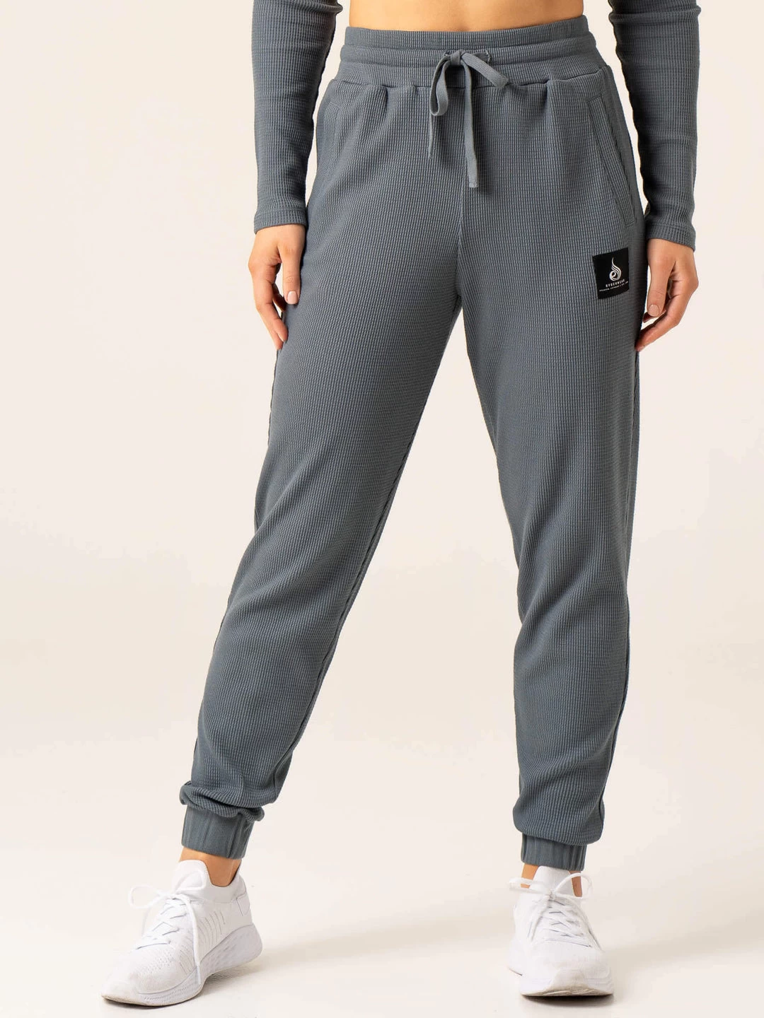 Model is 173cm tall. She usually wears a size S and is wearing a size S. Her waist measures 68cm and her hips measure 96cm. High waisted Welt pockets Ribbed cuff detail Relaxed fit Waistband with internal elastic and adjustable drawcords Woven Ryderwear label Made from a soft waffle textured fabric Inner leg seam: 69cm Main: 60% Cotton/40% PolyesterContrast: 57% Cotton/38% Polyester/5% ElastaneLining: 60% Polyester/40% PolyesterRecommended for lifestyle.